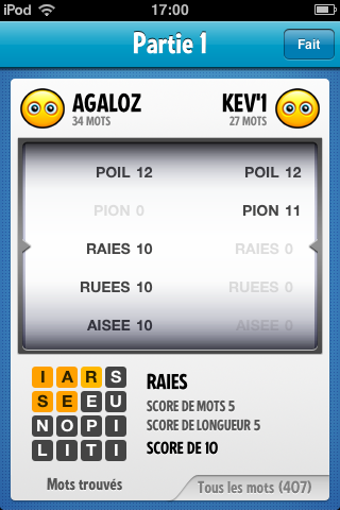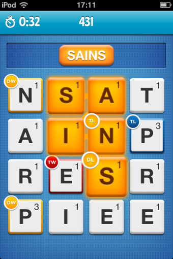 Under spelet får du extra poäng genom att använda bokstäver markerade med dubbel/trippel bokstavs/ordsymboler. Det är liknande Apalabrados. Vinnaren är den som får flest poäng på tre rundor.